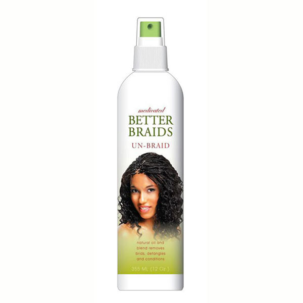 • Better Braids Medicated Unbraid is a multi-purpose formula specially formulated to reduce braid removal time up to 50% and it works to provide and protect the hair and scalp with easier comb out during the braid removal process. Enriched with a special oil blend of Avocado, Olive and Jojoba Oils. It helps to soothe the scalp as it restores and seals moisture into the hair and scalp.